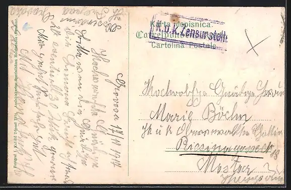 gelaufen 1917, Briefmarke entfernt, rückseitig Oberflächenschaden, Bugspur li. oben