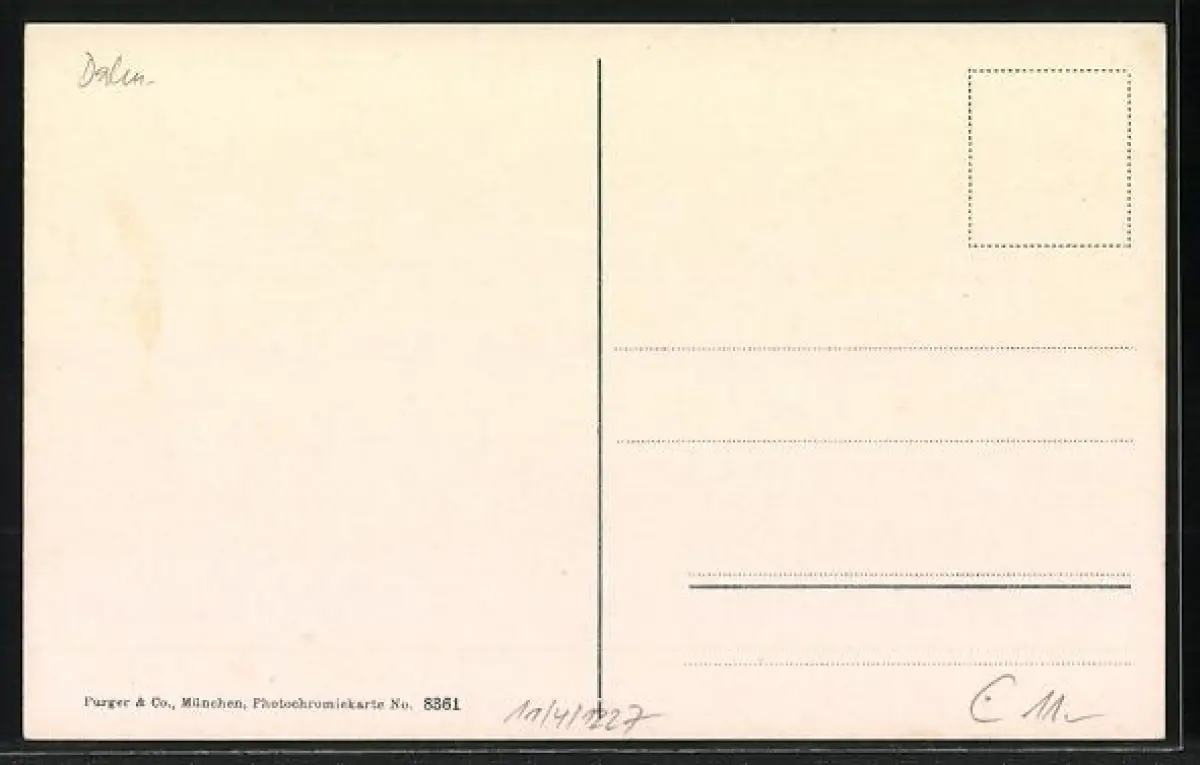 Personenbezogene Daten auf der Rückseite der Karte wurden durch blauen Textmarker unkenntlich gemacht. Die blauen Stellen sind auf die Vorderseite durchgeweicht und wirken sich negativ auf das Postkartenfoto aus