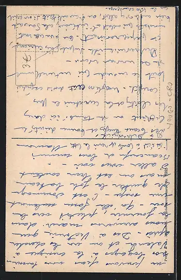 Personenbezogene Daten auf der Rückseite der Karte wurden durch blauen Textmarker unkenntlich gemacht. Die blauen Stellen sind auf die Vorderseite durchgeweicht und wirken sich negativ auf das Postkartenfoto aus