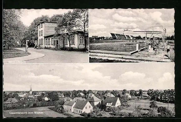 AK Rahden i. W., Bahnhofsplatz, Freibad, Gesamtansicht