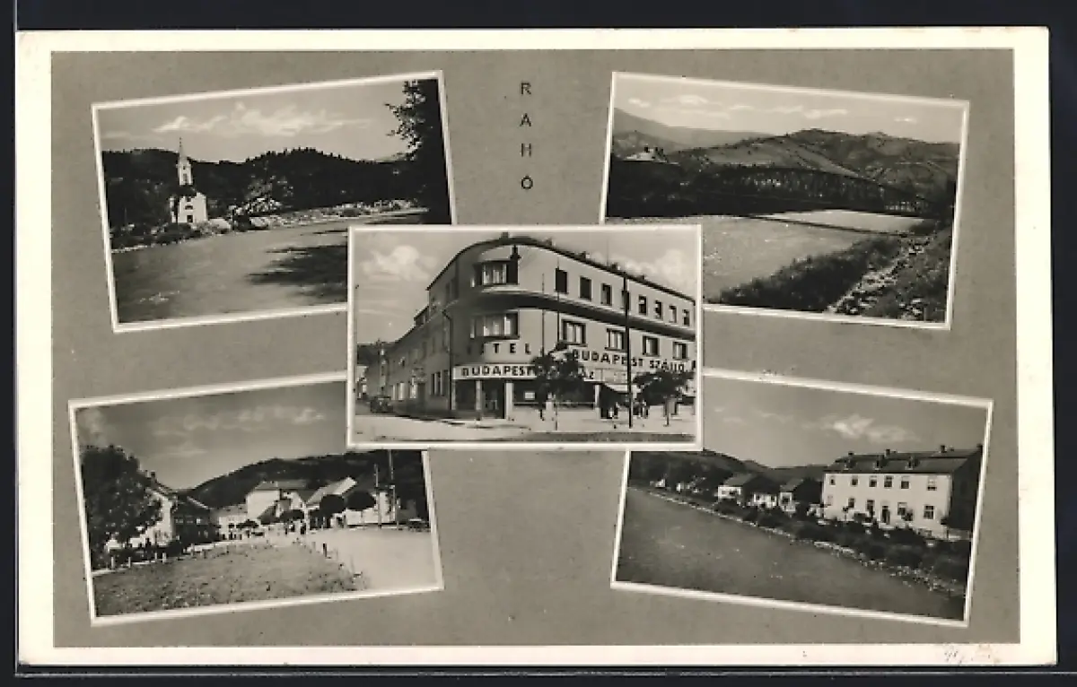 AK Raho, Hotel Budapest, Strassenpartie, Kirche, Flusspartie