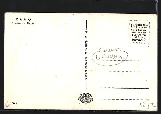 Personenbezogene Daten auf der Rückseite der Karte wurden durch blauen Textmarker unkenntlich gemacht. Die blauen Stellen sind auf die Vorderseite durchgeweicht und wirken sich negativ auf das Postkartenfoto aus