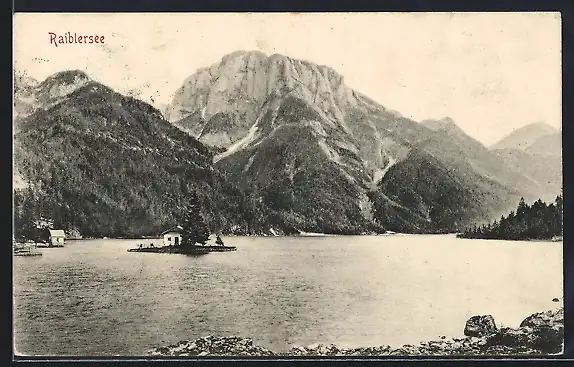 AK Raibl, Raiblersee, Insel und Bergpanorama