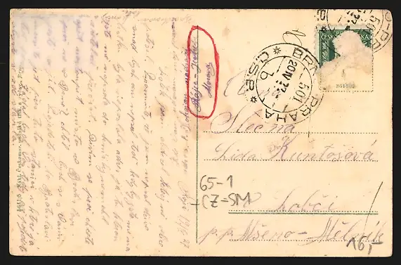 gelaufen 1927, geklebter Eckknick re. oben, Briefmarke entfernt, Bugspur li. unten, guter Zustand