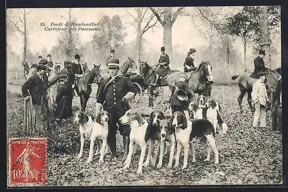 AK Rambouillet, La Forêt, Carrefour des Paresseux, Jäger zu Pferde mit Hunden