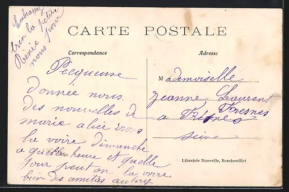 Personenbezogene Daten auf der Rückseite der Karte wurden durch blauen Textmarker unkenntlich gemacht. Die blauen Stellen sind auf die Vorderseite durchgeweicht und wirken sich negativ auf das Postkartenfoto aus