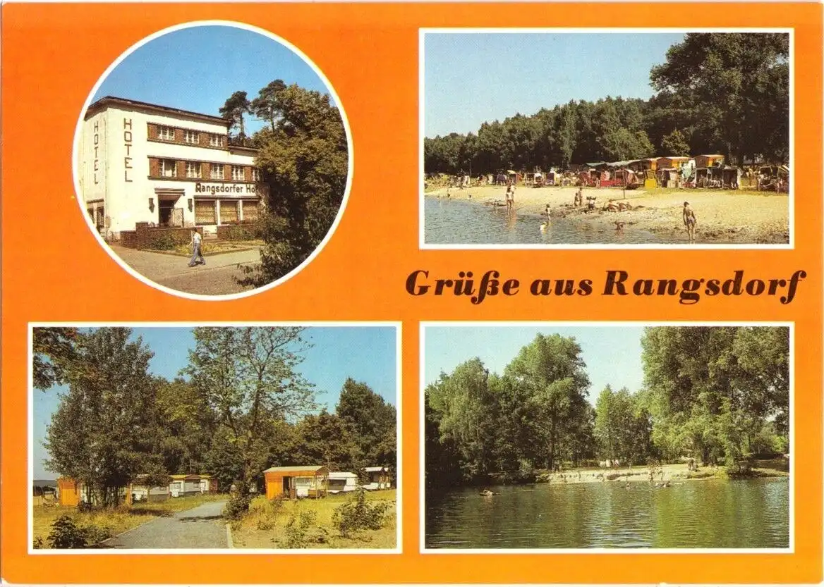 Ansichtskarte Rangsdorf Kr. Zossen vier Abb., gestaltet Hotel "Rangsdorfer Hof", Strandbad am Rangsdorfer See, Campingplatz, Am Nymphensee Erhaltung I ungelaufen Druckvermerk: 1987 Herstellungsland: DDR Verlag: Bild und Heimat, Reichenbach i. V. - 01 04 0491/17