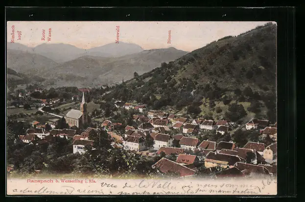 AK Ranspach bei Wesserling i. Els., Ortsansicht mit Berggipfeln aus der Vogelschau
