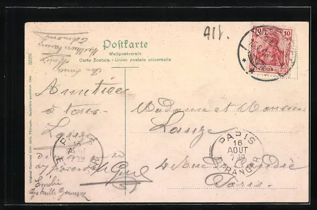 Personenbezogene Daten auf der Rückseite der Karte wurden durch blauen Textmarker unkenntlich gemacht. Die blauen Stellen sind auf die Vorderseite durchgeweicht und wirken sich negativ auf das Postkartenfoto aus