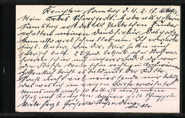 Personenbezogene Daten auf der Rückseite der Karte wurden durch blauen Textmarker unkenntlich gemacht. Die blauen Stellen sind auf die Vorderseite durchgeweicht und wirken sich negativ auf das Postkartenfoto aus