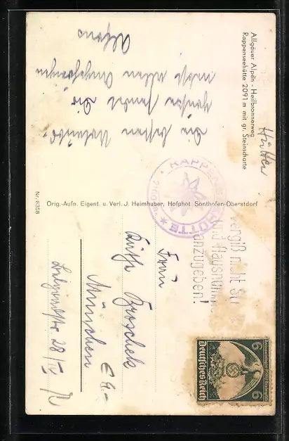 Personenbezogene Daten auf der Rückseite der Karte wurden durch blauen Textmarker unkenntlich gemacht. Die blauen Stellen sind auf die Vorderseite durchgeweicht und wirken sich negativ auf das Postkartenfoto aus