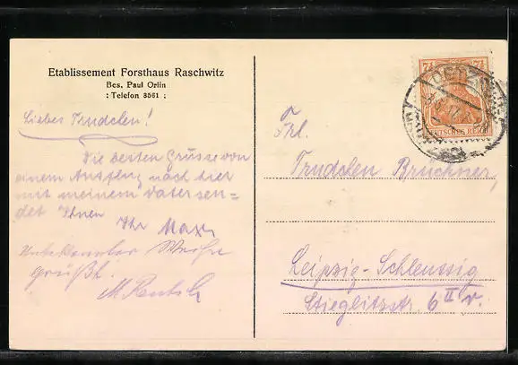 AK Raschwitz, Forsthaus Raschwitz, Garten, Saal und Colonnade