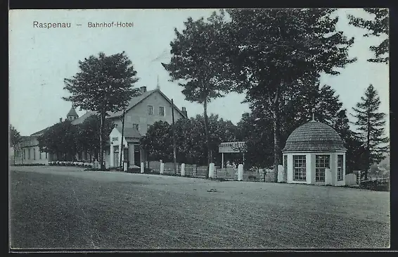 AK Raspenau, Strassenpartie am Bahnhof-Hotel