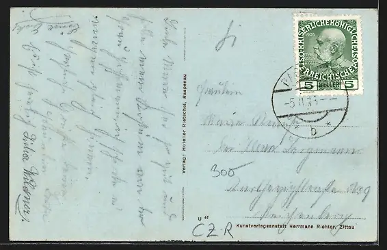 Personenbezogene Daten auf der Rückseite der Karte wurden durch blauen Textmarker unkenntlich gemacht. Die blauen Stellen sind auf die Vorderseite durchgeweicht und wirken sich negativ auf das Postkartenfoto aus
