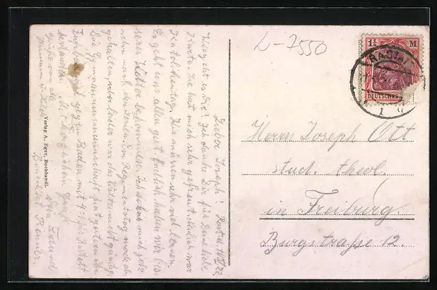 Personenbezogene Daten auf der Rückseite der Karte wurden durch blauen Textmarker unkenntlich gemacht. Die blauen Stellen sind auf die Vorderseite durchgeweicht und wirken sich negativ auf das Postkartenfoto aus