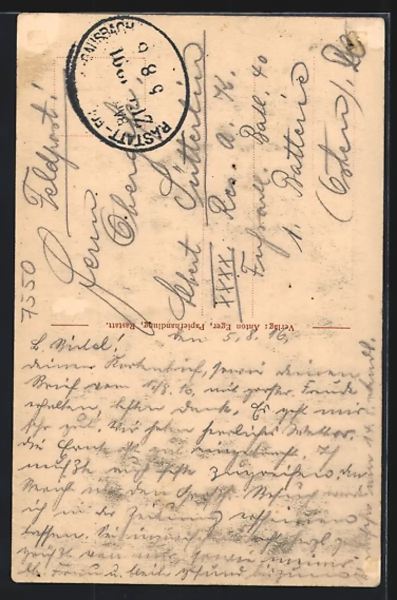 alte Ansichtskarte, gelaufen 1916, Eckknicke re. oben u. li., rückseitig Klebe- und Papierreste, rückseitig Oberflächenschaden, Stempelspur