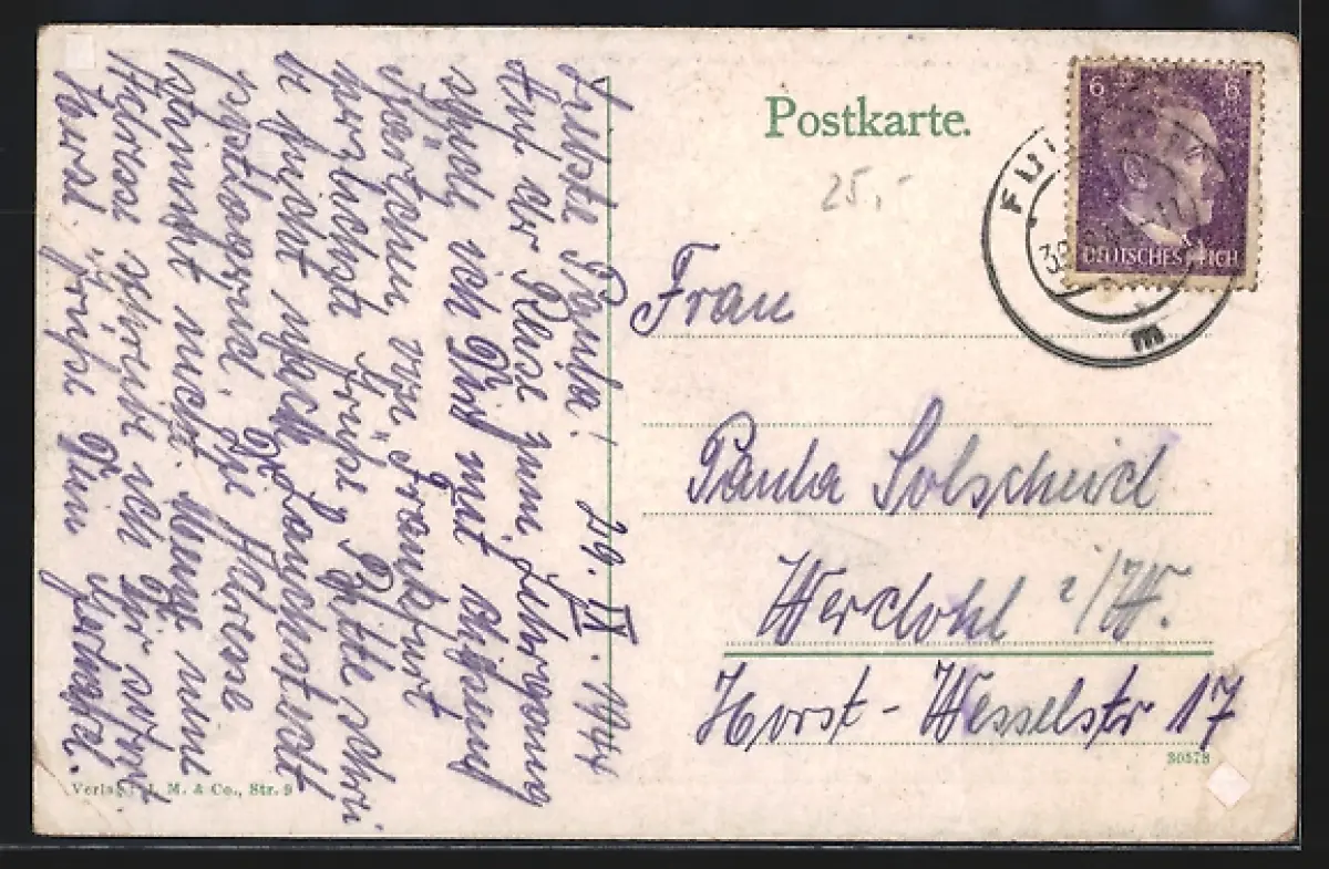 Personenbezogene Daten auf der Rückseite der Karte wurden durch blauen Textmarker unkenntlich gemacht. Die blauen Stellen sind auf die Vorderseite durchgeweicht und wirken sich negativ auf das Postkartenfoto aus