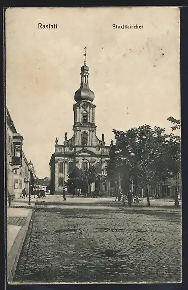 AK Rastatt, Stadtkirche mit Strassenpartie