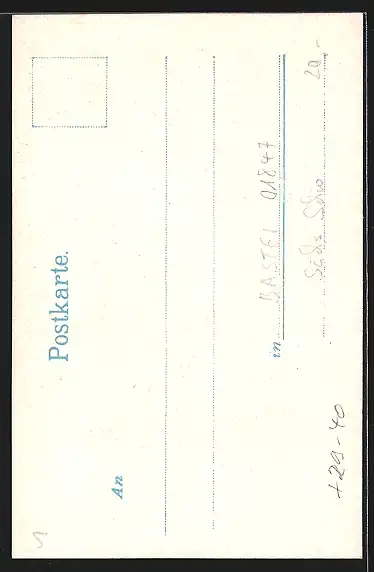 Personenbezogene Daten auf der Rückseite der Karte wurden durch blauen Textmarker unkenntlich gemacht. Die blauen Stellen sind auf die Vorderseite durchgeweicht und wirken sich negativ auf das Postkartenfoto aus