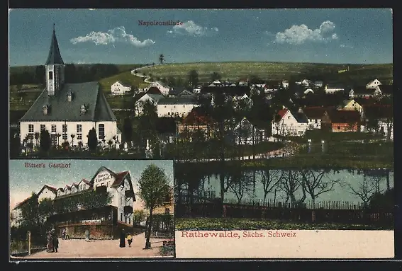 AK Rathewalde /Sächs. Schweiz, Gasthof Ritter, Ortsansicht mit Kirche
