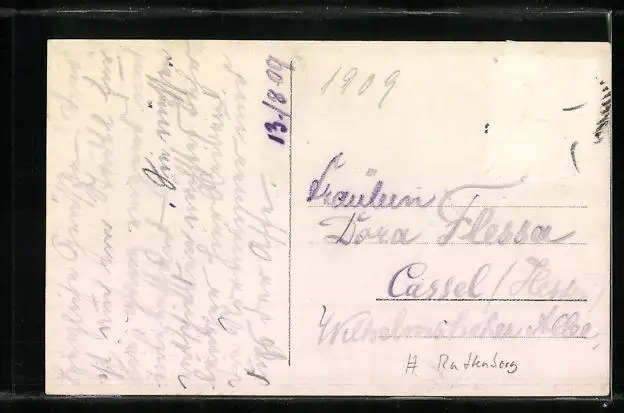 Personenbezogene Daten auf der Rückseite der Karte wurden durch blauen Textmarker unkenntlich gemacht. Die blauen Stellen sind auf die Vorderseite durchgeweicht und wirken sich negativ auf das Postkartenfoto aus