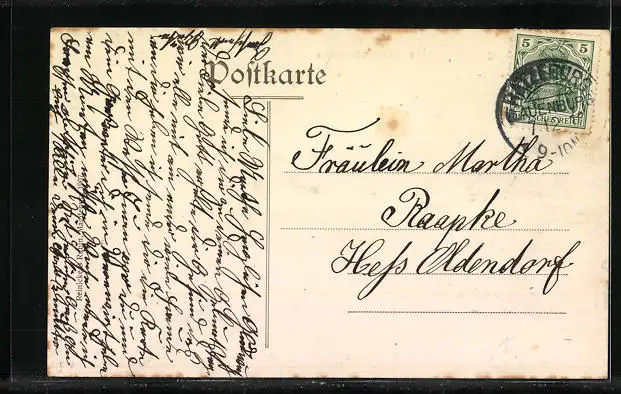 Personenbezogene Daten auf der Rückseite der Karte wurden durch blauen Textmarker unkenntlich gemacht. Die blauen Stellen sind auf die Vorderseite durchgeweicht und wirken sich negativ auf das Postkartenfoto aus