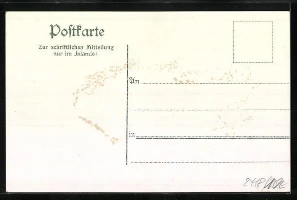 Personenbezogene Daten auf der Rückseite der Karte wurden durch blauen Textmarker unkenntlich gemacht. Die blauen Stellen sind auf die Vorderseite durchgeweicht und wirken sich negativ auf das Postkartenfoto aus