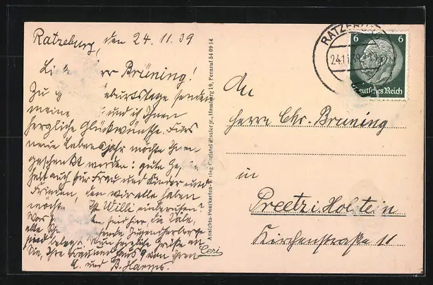 alte Ansichtskarte, gelaufen 1939, rückseitig Klebe- und Papierreste, guter Zustand