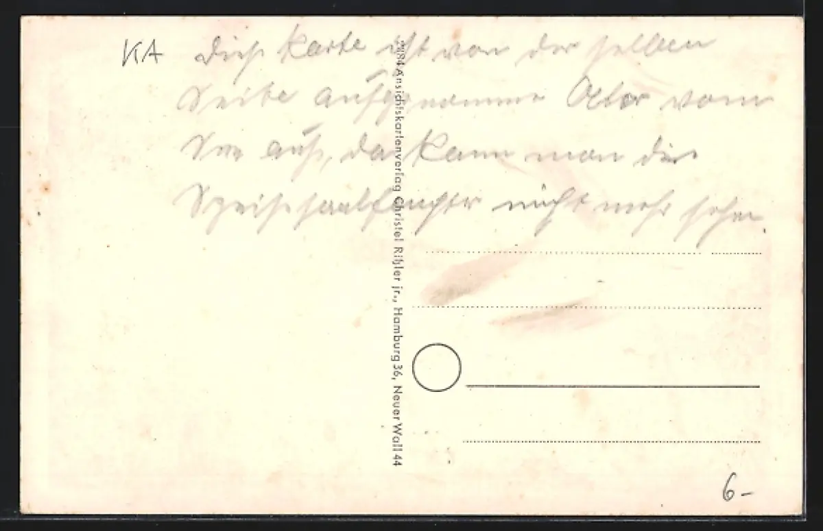Personenbezogene Daten auf der Rückseite der Karte wurden durch blauen Textmarker unkenntlich gemacht. Die blauen Stellen sind auf die Vorderseite durchgeweicht und wirken sich negativ auf das Postkartenfoto aus