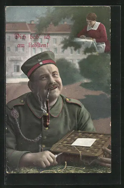 AK Rauchen, Soldat in Uniform mit Pfeife und Geschenkkorb in Erinnerung an seine Frau