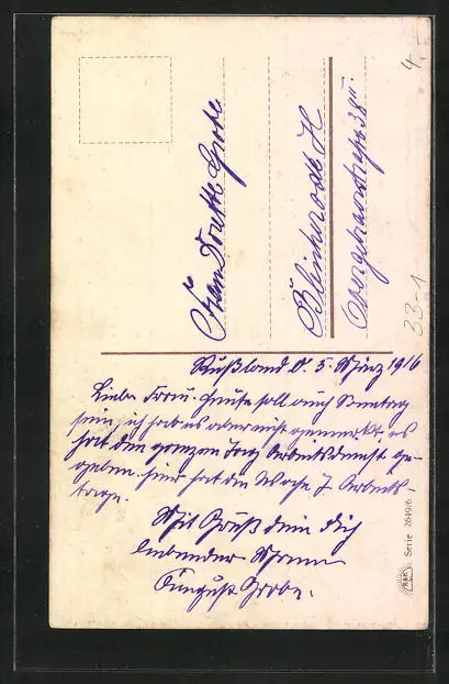 Personenbezogene Daten auf der Rückseite der Karte wurden durch blauen Textmarker unkenntlich gemacht. Die blauen Stellen sind auf die Vorderseite durchgeweicht und wirken sich negativ auf das Postkartenfoto aus