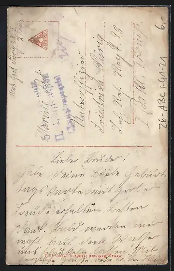 Personenbezogene Daten auf der Rückseite der Karte wurden durch blauen Textmarker unkenntlich gemacht. Die blauen Stellen sind auf die Vorderseite durchgeweicht und wirken sich negativ auf das Postkartenfoto aus