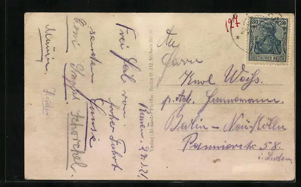 Personenbezogene Daten auf der Rückseite der Karte wurden durch blauen Textmarker unkenntlich gemacht. Die blauen Stellen sind auf die Vorderseite durchgeweicht und wirken sich negativ auf das Postkartenfoto aus
