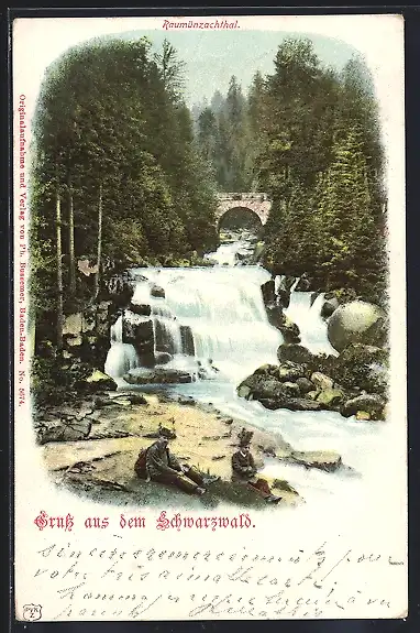AK Raumünzachthal /Schwarzwald, Wasserfall mit zwei Besuchern