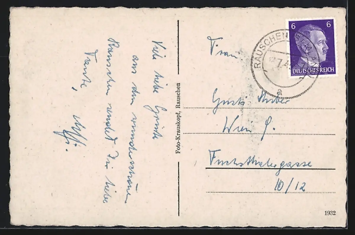 Personenbezogene Daten auf der Rückseite der Karte wurden durch blauen Textmarker unkenntlich gemacht. Die blauen Stellen sind auf die Vorderseite durchgeweicht und wirken sich negativ auf das Postkartenfoto aus