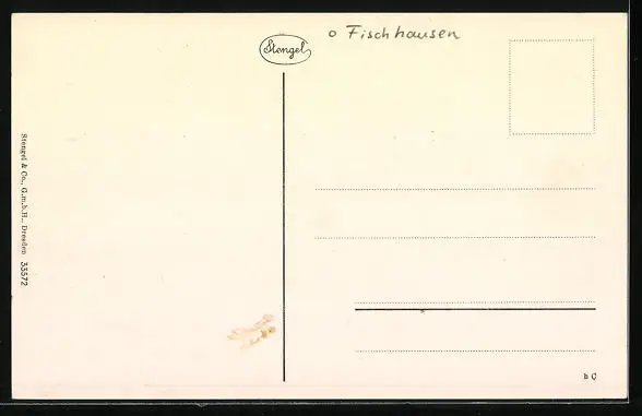 Personenbezogene Daten auf der Rückseite der Karte wurden durch blauen Textmarker unkenntlich gemacht. Die blauen Stellen sind auf die Vorderseite durchgeweicht und wirken sich negativ auf das Postkartenfoto aus