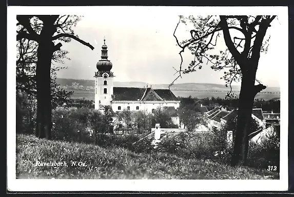 AK Ravelsbach, Blick von der Bergwiese auf Ort und Kirche