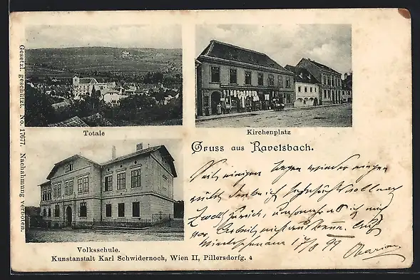 AK Ravelsbach, Totalansicht, Volksschule, Kirchenplatz