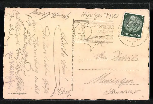 Personenbezogene Daten auf der Rückseite der Karte wurden durch blauen Textmarker unkenntlich gemacht. Die blauen Stellen sind auf die Vorderseite durchgeweicht und wirken sich negativ auf das Postkartenfoto aus