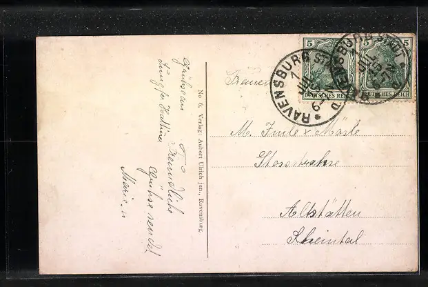 Personenbezogene Daten auf der Rückseite der Karte wurden durch blauen Textmarker unkenntlich gemacht. Die blauen Stellen sind auf die Vorderseite durchgeweicht und wirken sich negativ auf das Postkartenfoto aus