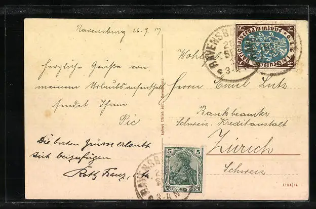 Personenbezogene Daten auf der Rückseite der Karte wurden durch blauen Textmarker unkenntlich gemacht. Die blauen Stellen sind auf die Vorderseite durchgeweicht und wirken sich negativ auf das Postkartenfoto aus