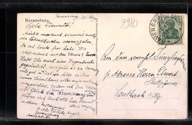 Personenbezogene Daten auf der Rückseite der Karte wurden durch blauen Textmarker unkenntlich gemacht. Die blauen Stellen sind auf die Vorderseite durchgeweicht und wirken sich negativ auf das Postkartenfoto aus
