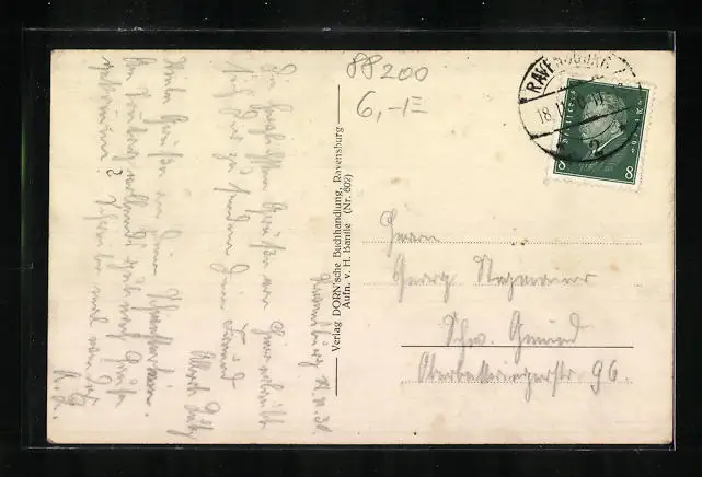 Personenbezogene Daten auf der Rückseite der Karte wurden durch blauen Textmarker unkenntlich gemacht. Die blauen Stellen sind auf die Vorderseite durchgeweicht und wirken sich negativ auf das Postkartenfoto aus
