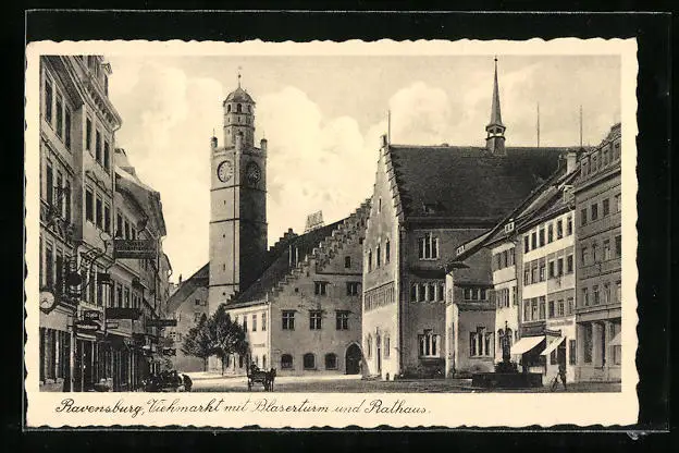 AK Ravensburg, Viehmarkt mit Blaserturm und Rathaus