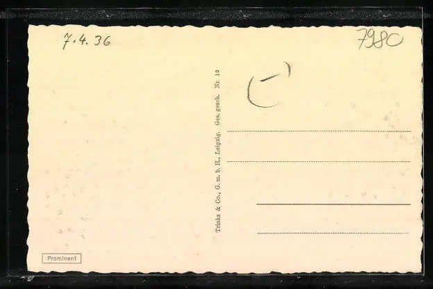 Personenbezogene Daten auf der Rückseite der Karte wurden durch blauen Textmarker unkenntlich gemacht. Die blauen Stellen sind auf die Vorderseite durchgeweicht und wirken sich negativ auf das Postkartenfoto aus