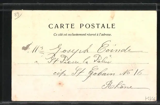 Personenbezogene Daten auf der Rückseite der Karte wurden durch blauen Textmarker unkenntlich gemacht. Die blauen Stellen sind auf die Vorderseite durchgeweicht und wirken sich negativ auf das Postkartenfoto aus