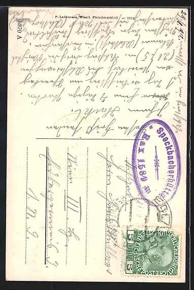 Personenbezogene Daten auf der Rückseite der Karte wurden durch blauen Textmarker unkenntlich gemacht. Die blauen Stellen sind auf die Vorderseite durchgeweicht und wirken sich negativ auf das Postkartenfoto aus