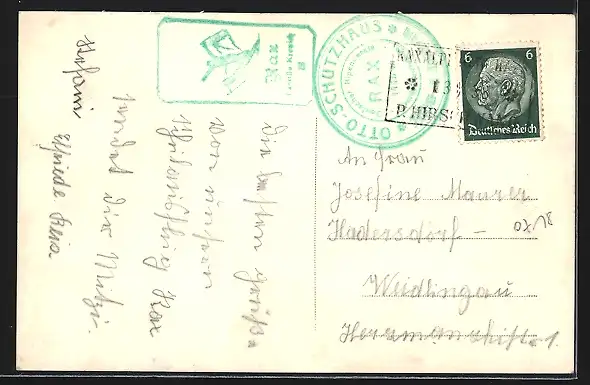 Personenbezogene Daten auf der Rückseite der Karte wurden durch blauen Textmarker unkenntlich gemacht. Die blauen Stellen sind auf die Vorderseite durchgeweicht und wirken sich negativ auf das Postkartenfoto aus
