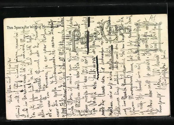 Personenbezogene Daten auf der Rückseite der Karte wurden durch blauen Textmarker unkenntlich gemacht. Die blauen Stellen sind auf die Vorderseite durchgeweicht und wirken sich negativ auf das Postkartenfoto aus