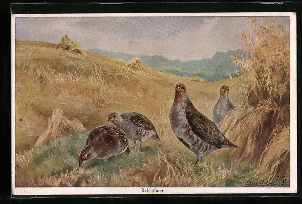 AK Rebhühner an einem Garbenfeld
